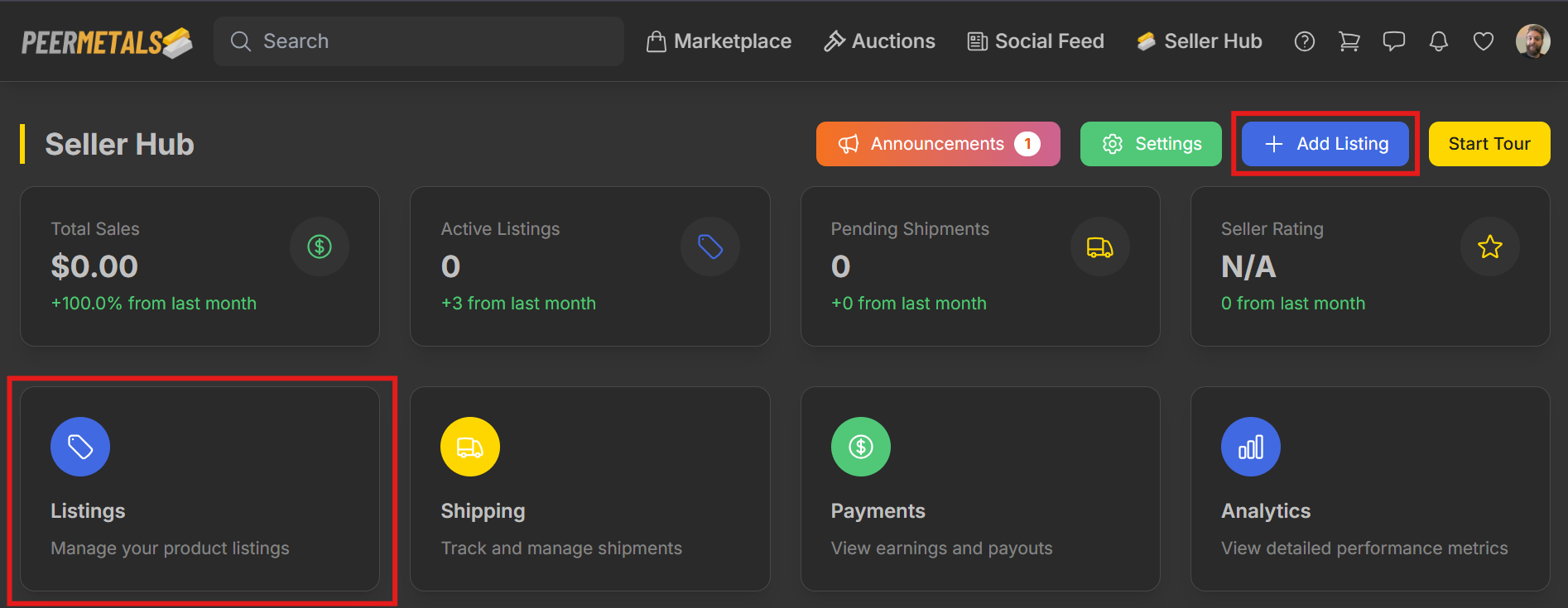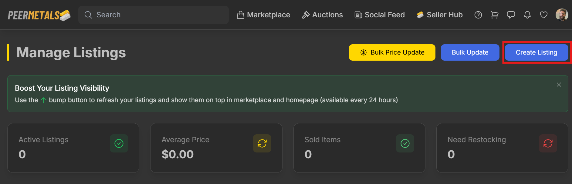 Creating a new listing on PeerMetals is simple, fast, and designed to help your item get discovered by the right buyers. Whether you're selling bullion, numismatics, or other precious metal products, the Seller Hub provides all the tools you need to create detailed and professional listings.